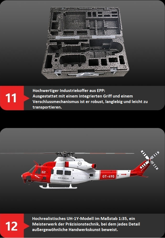 Angetrieben von der Mission – der Goosky E2 GPS ist ein Hubschrauber im Maßstab 1:35, ein Elite-Hubschrauber mit exquisiter Verarbeitung und kunstvollem Design. Ausgestattet mit einem intelligenten und stabilen Flugsteuerungssystem ist er nicht nur eine Hommage an Präzisionstechnik, sondern auch ein herzlicher Gruß an alle, die uns schützen und dienen.