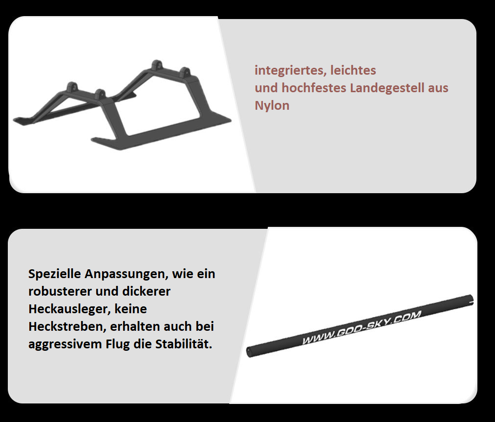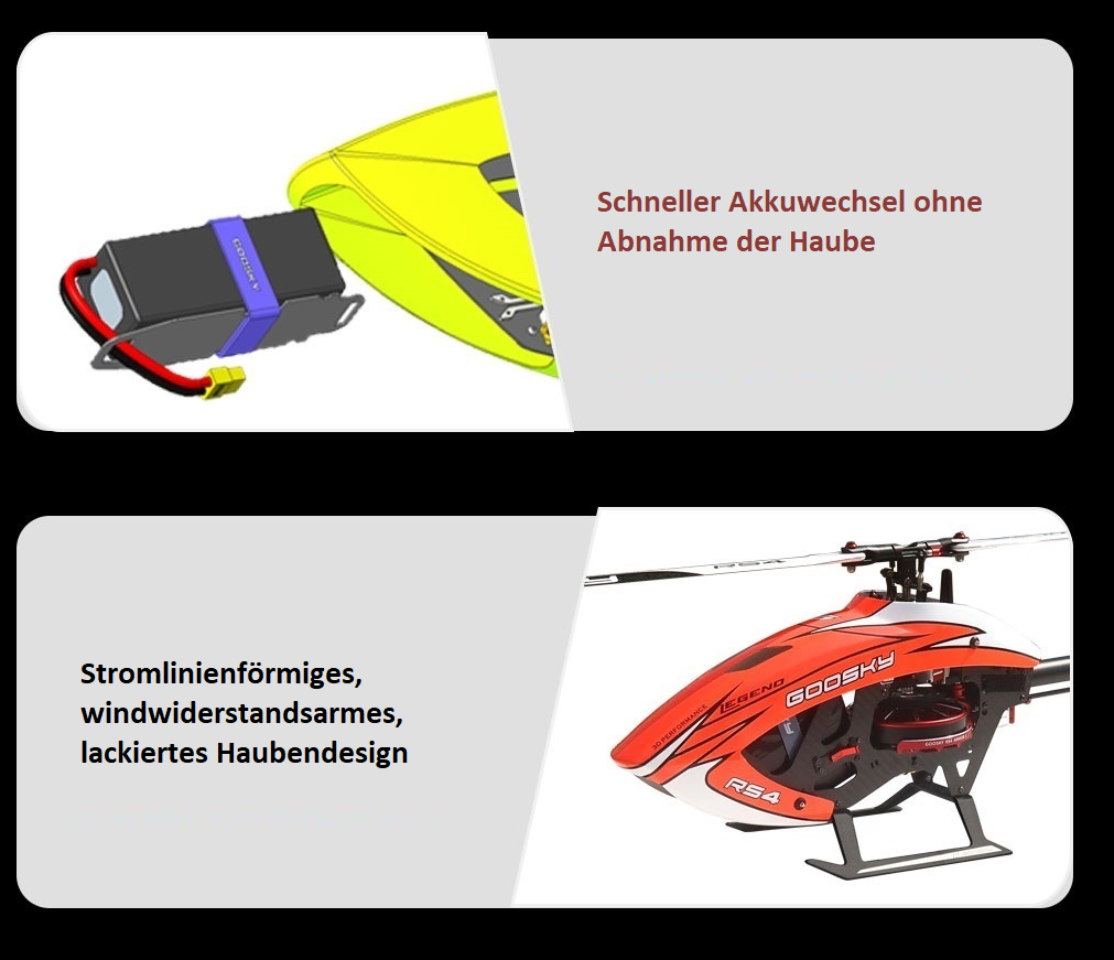 Der RS4 Venom ist ein Hochleistungs-3D-Kunsthubschrauber, der vom GOOSKY Forschungs- und Entwicklungsteam speziell für internationale Kunden entwickelt wurde. Er zeichnet sich durch zahlreiche innovative Designmerkmale aus, ist benutzerfreundlicher, wartungsfreundlicher, bietet extremere Leistung, mehr Power, ein dynamischeres Flugverhalten und ein unvergleichliches Flugerlebnis.