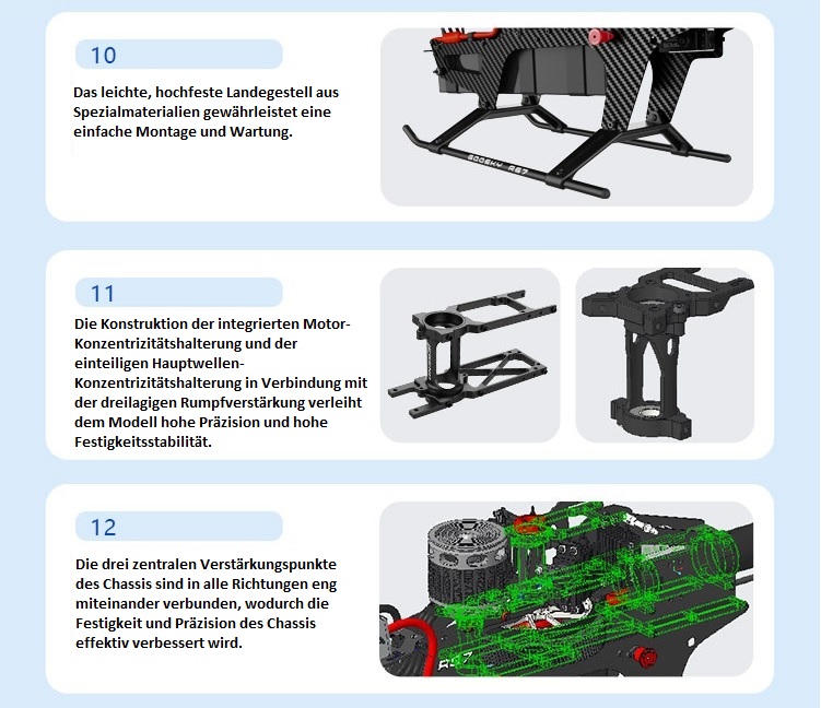 Der Goosky RS7 Legend Elektro-Helikopter-Bausatz ist ein außergewöhnlicher Helikopter mit einem extrem leistungsfähigen Hauptrahmen, der die Grundlage für ein legendäres Flugerlebnis bildet. Gefertigt aus hochwertiger Kohlefaser und Aluminium, garantiert dieser Helikopter-Bausatz Langlebigkeit bei gleichzeitig geringem Gewicht. Das innovative Design basiert auf fortschrittlichen Konstruktionsprinzipien und ermöglicht so optimale Leistung und Manövrierfähigkeit. Die Schnellwechsel-Akkuhalterung erhöht den Flugkomfort zusätzlich und ermöglicht einen effizienten und problemlosen Akkuwechsel für längere Flugsessions.